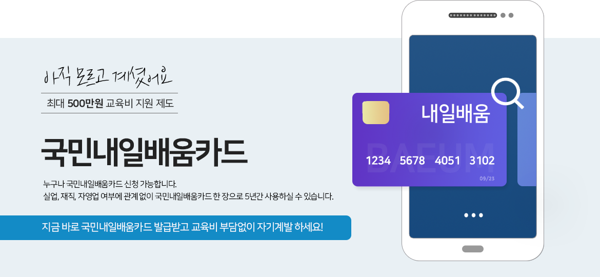 실업, 재직, 자영업 여부에 관계 없이 국민내일배움카드 한 장으로 5년간 사용 가능
